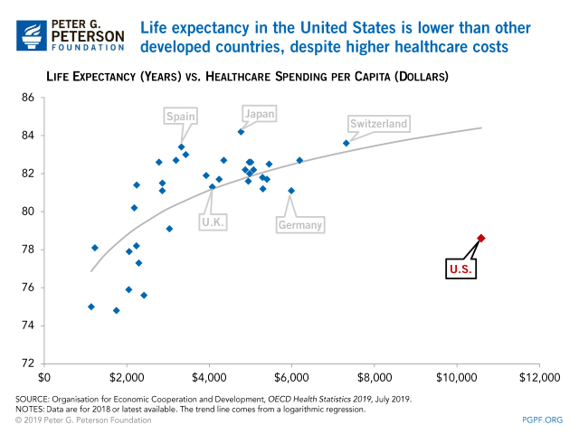 The U.S. currently spends far more than any other country on health care but ranks only 32nd in life expectancy and other key health indicators like the growing epidemic of chronic disease. Overall healthcare costs — including all private and public spending — are anticipated to rise by an average of 5.5 percent per year over the next decade — growing from $3.5 trillion in 2017 to $6 trillion by 2027.
